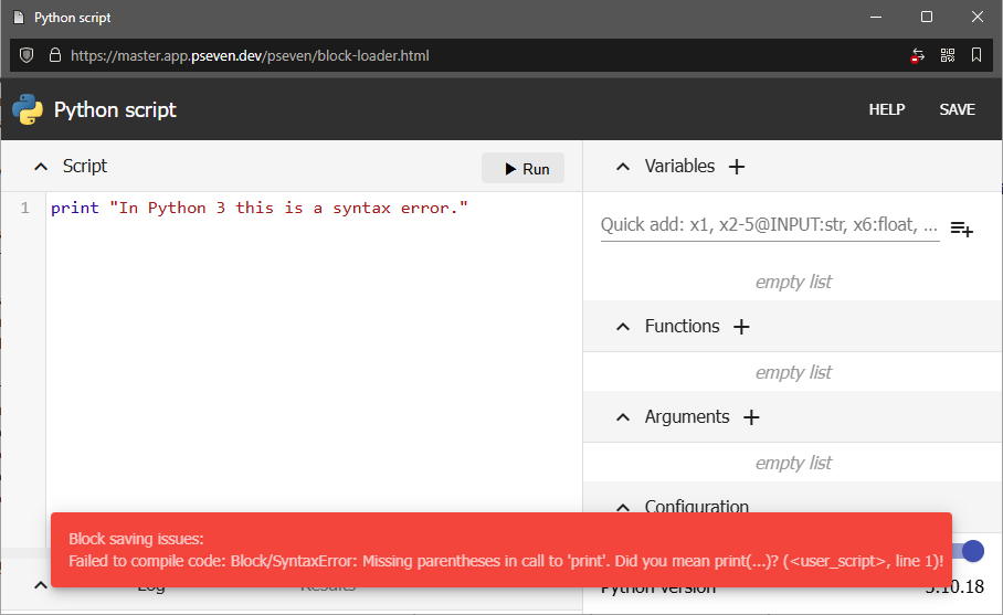 - 1095 Fixed a similar issue where pSeven did not properly stop a block if there was an error while editing its configuration. Now pSeven automatically stops a block running in the edit mode if it becomes unresponsive.