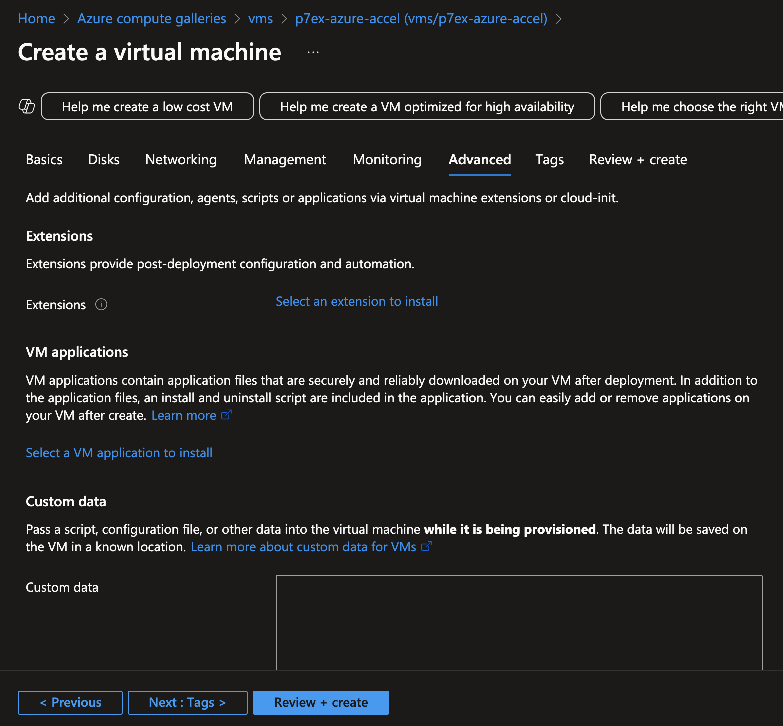 Azure - advanced settings: accept defaults