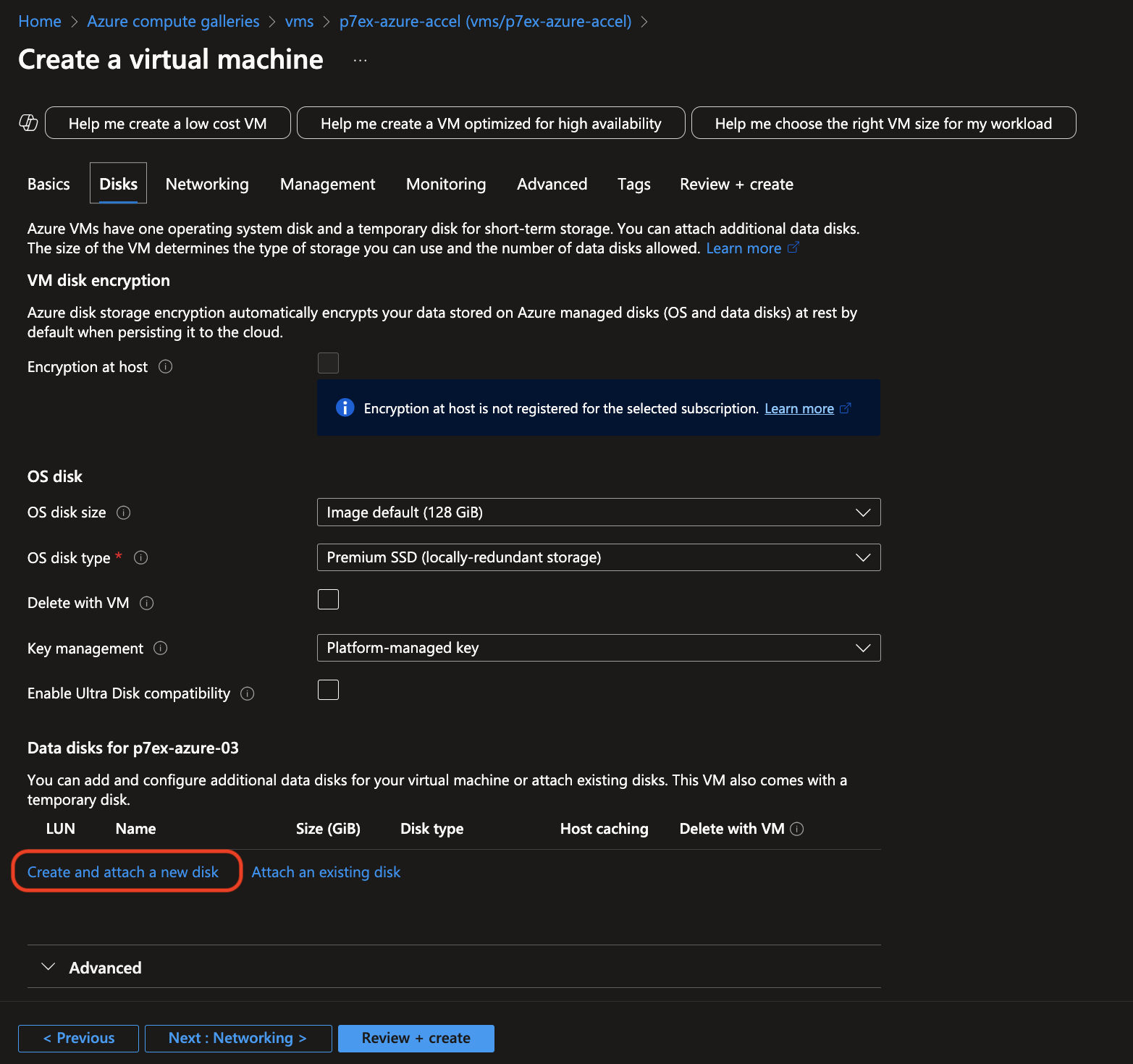 Set up the data storage disk as shown. The minimum size is 500 GB. You can expand the storage size later.