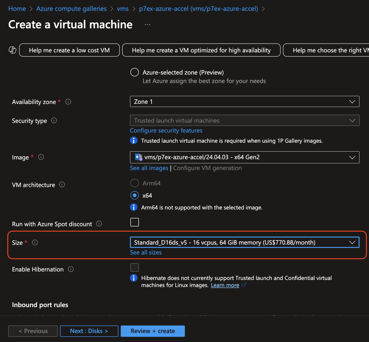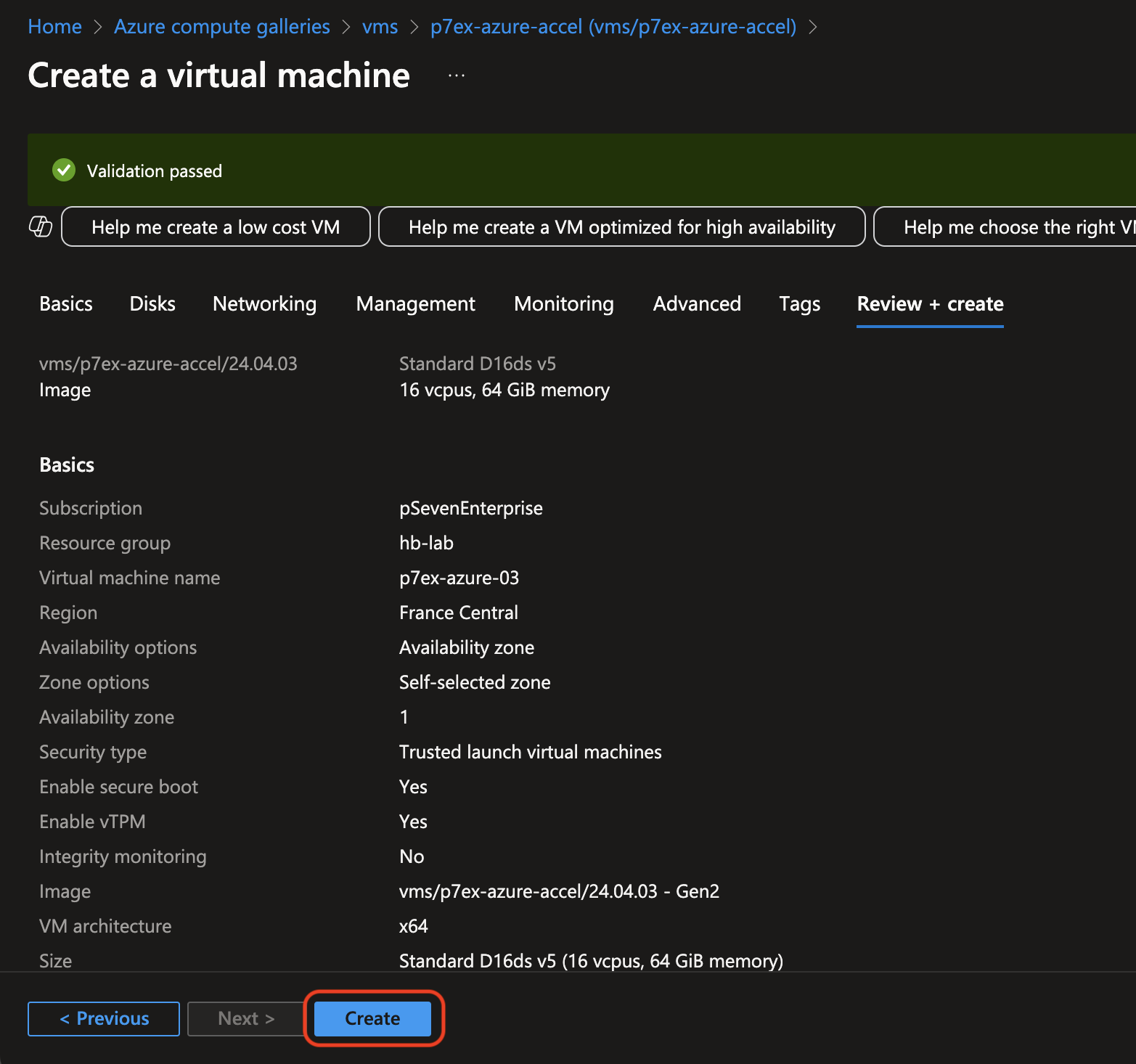 Confirm your VM settings in the Review + create tab and click Create.