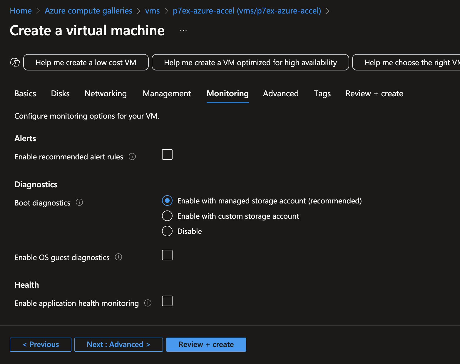 Azure - monitoring settings: accept defaults