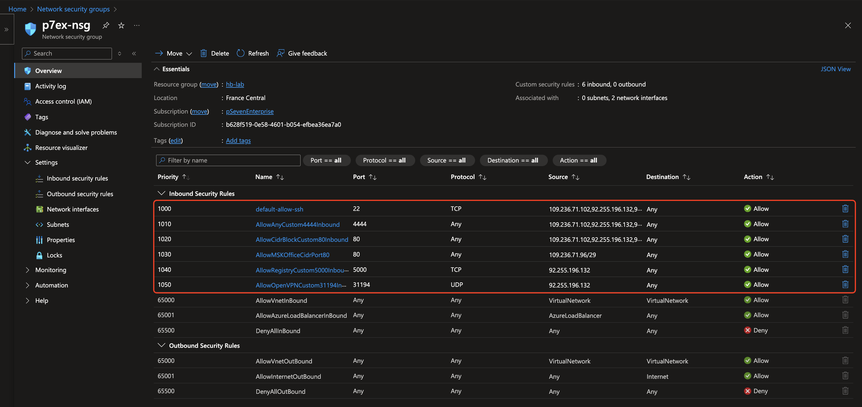 Azure - network rules: allow inbound 22/tcp, 4444/tcp, 80/tcp, 5000/tcp, 31194/udp -
