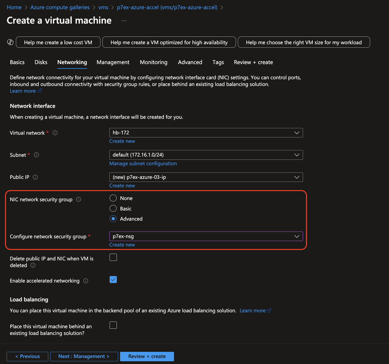 - NIC network security group: "Advanced"