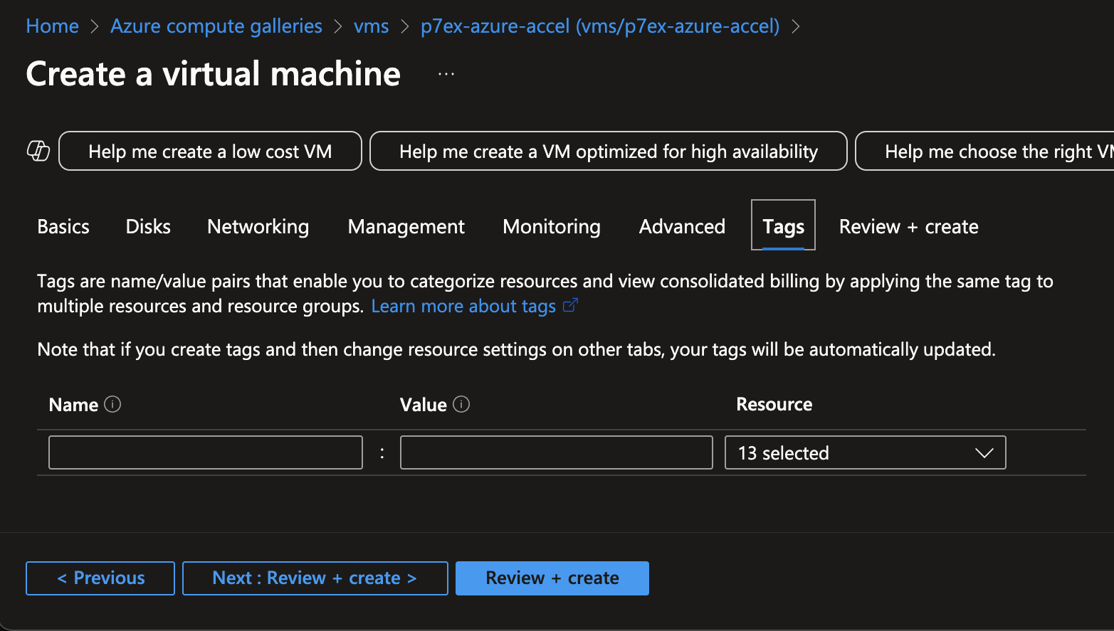Azure - tag settings: accept defaults -