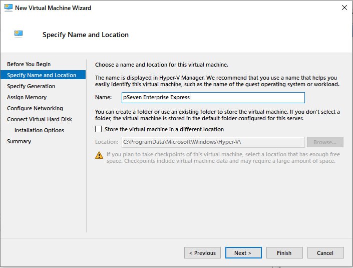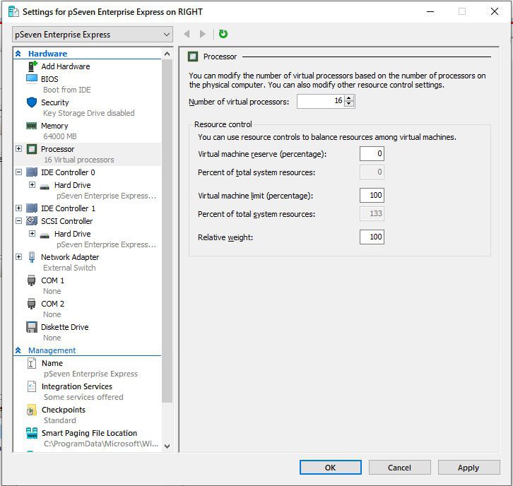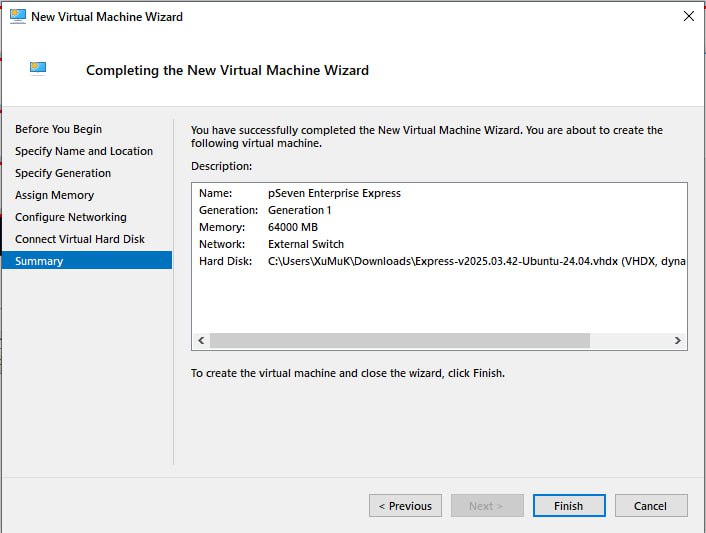 This section provides guidelines for pSeven Enterprise Express deployment in Microsoft Hyper-V. Set up a Hyper-V VM following these guidelines, then complete all steps in the Deployment section, starting with step 2.