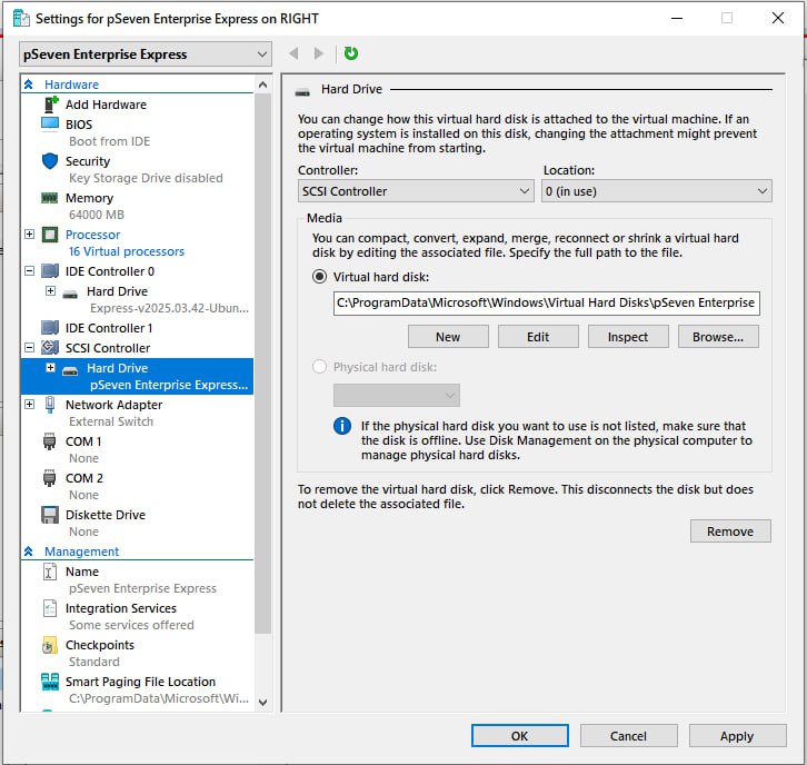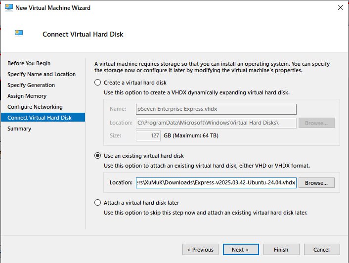 Hyper-V - add the VM boot disk: attach the pSeven Enterprise Express VHDX disk image -