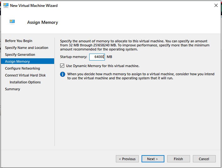 Hyper-V - assign 64 GB or more memory to the VM -