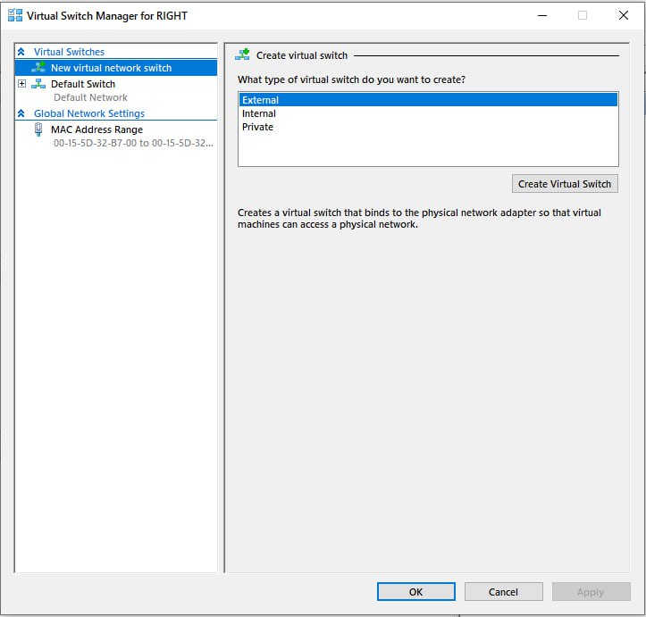 Create a new virtual switch dedicated for pSeven Enterprise Express. Select the switch type: "External".