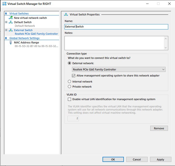 Hyper-V - virtual switch settings for pSeven Enterprise Express -