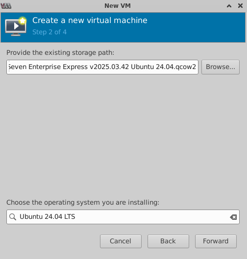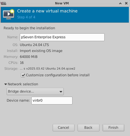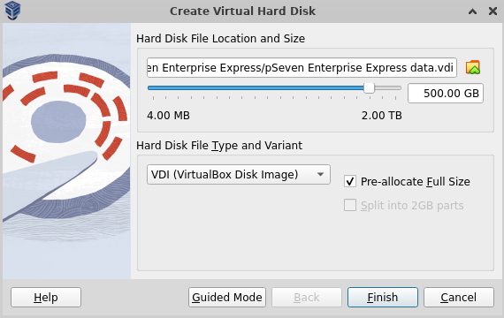 pSeven Enterprise Express v{YYYY.MM.DD}.qcow2- this is the boot disk - Create and attach an empty disk for data storage, 500 GB or greater